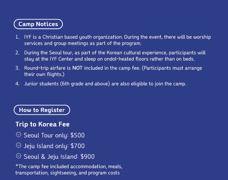 Hosted by the IYF, Trip to Korea is a cultural retreat for international fans of Korean culture. Participants explore Korean culture, tourist sites, and cuisine, while engaging in leadership development and global cultural interaction. The first week features the IYF World Camp with participants from over 50 countries, and the second week includes tours of exciting venues in South Korea.